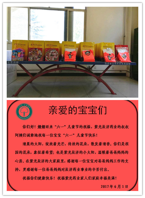 欢乐的笑语仍旧响彻在我们耳旁,喜悦的笑容依旧在荡漾。快乐的童年,我们与你作伴。成长的路上,我们牵着你一起远航。 为感谢员工子女对爸爸妈妈工作的支持,也为了祝福每一位员工子女节日快乐。公司为全厂员工子女准备了节日礼品,祝愿每一位紫光辰济药业小太阳们健康快乐。 2017年6月6日中午12点,满载着祝福的节日礼品早已摆满食堂,等待着大家分享喜悦。午饭时间,现场一片欢声笑语,大家都满满的洋溢着幸福的笑脸,大孩子有了一套运动装,锻炼身体倍儿棒,小孩子有积木和泡泡泥,益智游戏乐无穷。 大家都深切的感受到公司带给每个人的温暖与关怀,共同期待着公司能有更大更好的发展,在各自的工作岗位上努力拼搏,做出更大的贡献。