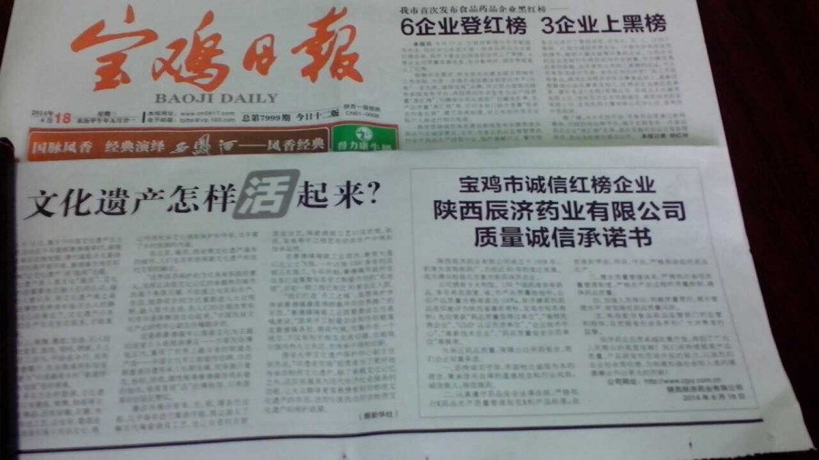 宝鸡市首次发布食品药品企业“红黑榜”恭贺辰济药业榜上有名
