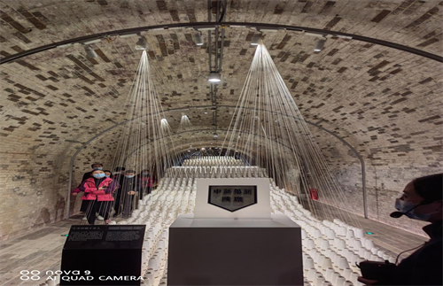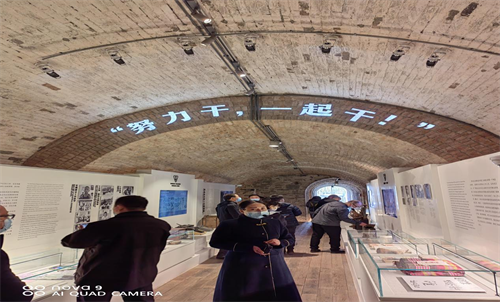 申新纱厂的窑洞工厂总长度1.75公里,其中长度在64米以上的窑洞有7孔,最长的达到109米,宽度基本在2米至6米之间,在地下构成纵横交错的网络。窑洞工厂上面,则是30多米厚的自然黄土覆盖层,十分坚固,利于掩护申新纱厂的工人前辈们冒着日军的轰炸坚守在自己的岗位上,生产军需民用品。抗战时期前线军需品80%是由宝鸡地区工合组织生产的,受到了前线后方的交口称赞。走进7号窑洞,大家不禁被眼前的画面所震撼,上万枚纱锭鳞次栉比,有序排列,同时纱锭以纱线连接光源,空中的上万条纱线如同一束束希望之光,象征着中华儿女不屈不挠的民族精神。