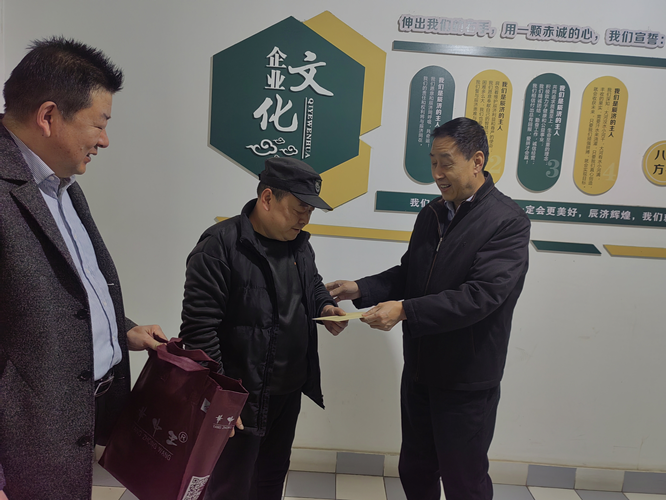 2024年1月31日上午,原宝鸡市政协副主席、宝鸡市慈善总会常务副会长李兴安,原宝鸡市食品药品监督管理局局长、宝鸡市慈善总会副会长韩满奎,原宝鸡市公路局局长、宝鸡市慈善总会副会长贾书义,宝鸡市慈善总会办公室杨主任一行莅临紫光辰济药业有限公司慰问困难职工,公司总经理冯建利、常务副总经理肖红星、副总经理王静、人事行政部经理张建华陪同慰问并进行了座谈。