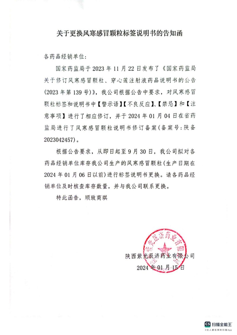 关于更换风寒感冒颗粒标签说明书的告知函 |